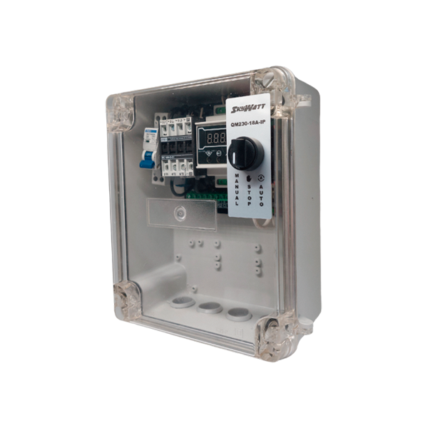 Constituído por disjuntor motor e placa de controlo, permite a ativação de turbinas trifásicas (400VAC) e turbinas monofásicas (230VAC).