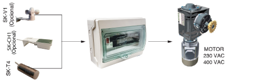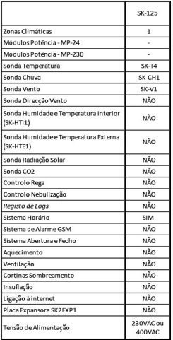 A consola climática SkyClima SK-125 disponibiliza o controlo e a potência numa única caixa prática de fácil instalação. Esta consola liga directamente o motor de tecto ou janela sem a necessidade da habitual caixa de proteção. A configuração em modo Automático é realizado através de um prático selector de botão. A consola possibilita ainda a instalação de uma Sonda de Vento e de uma Sonda de Chuva para uma eficaz salvaguarda da própria estrutura da estufa agrícola. • Selector de Funcionamento: Automático ou Manual; •Configuração das variáveis de forma fácil e intuitiva; •Controlo eficaz da temperatura - Sonda de Temperatura SK-T4 (uso obrigatório); •Definição dos parâmetros de vento e chuva para uma maior segurança da estufa (uso opcional); • Controlo horário e definição de períodos de funcionamento.