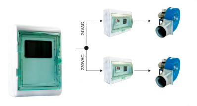 Constituído por disjuntor motor, placa de controlo e um relógio analógico, este módulo permite a activação de turbinas trifásicas (400V) e monofásicas (230V), para uma insuflação regular de ar no plástico da estufa (câmara de ar). Neste modelo, o elemento de accionamento são contactores de elevada performance da marca IMO Precision. O disjuntor-motor e a caixa de protecção são da marca Schneider-Electric. Disponibilizado numa alargada gama de potência (de 0,25A até 2,5A), pode, no entanto, ser ajustado às suas reais necessidades (sob consulta). C