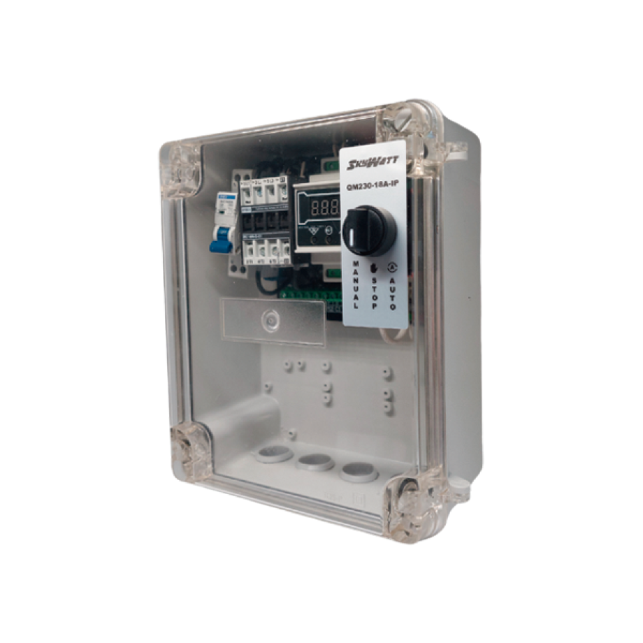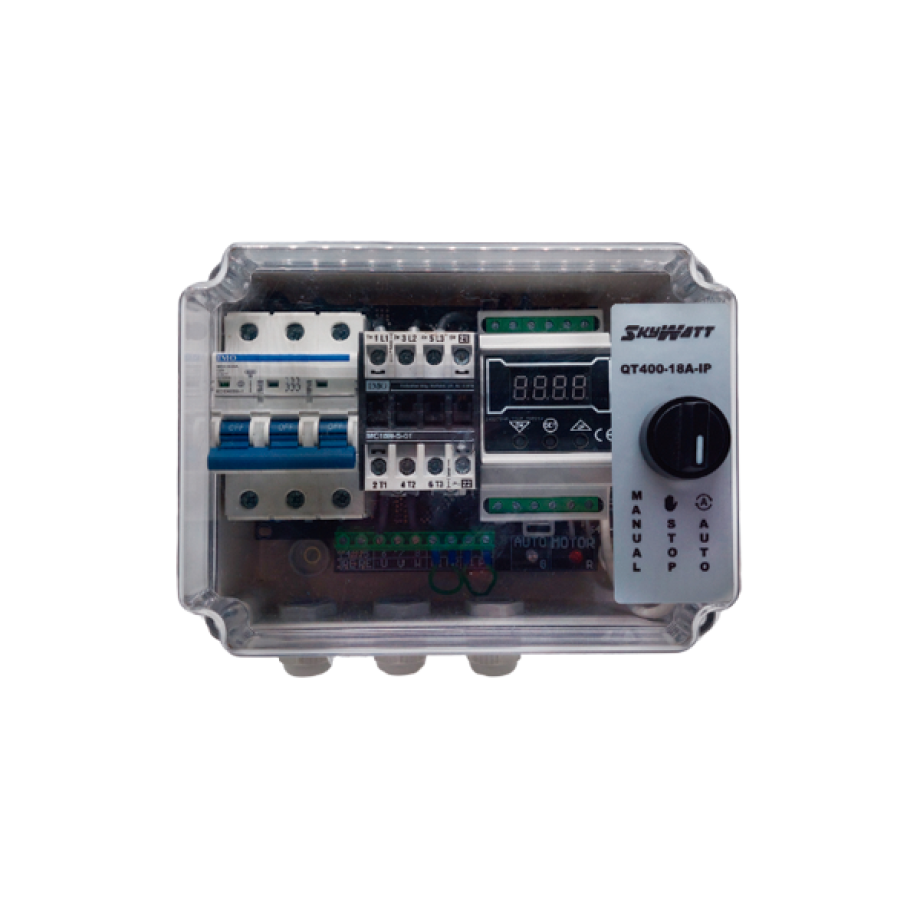 Dispositivo de controlo digital de bombas de água (motores e bombas submergíveis), para proteção contra sobrecargas, subcargas, falta de fase e excesso de arranques, mediante o controlo da intensidade e tensão.